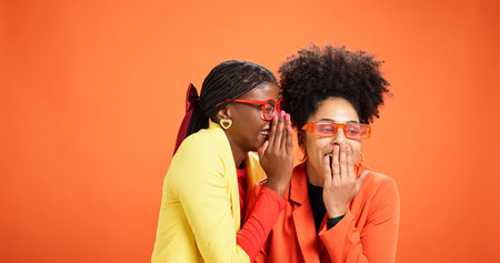 Gossip, secret and whisper with friends in studio for information, announcement and news. Wow, surprise and communication with African people on orange background for space, story and privacy