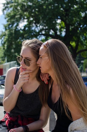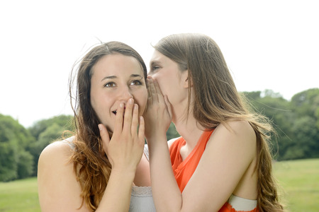 Two young female friends standing in a park talking and whispering, sharing secrets.