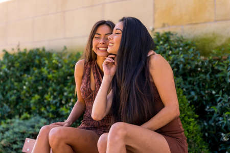 Two friends smiling and hugging sitting on a bench in the city in summer, lifestyle