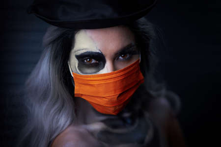 Spooky portrait of woman in halloween gotic makeup wearing protective mask