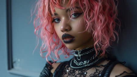 Teen Black Woman with Pink Curly Hair Goth style Illustration.