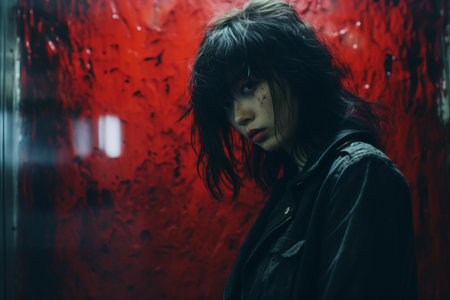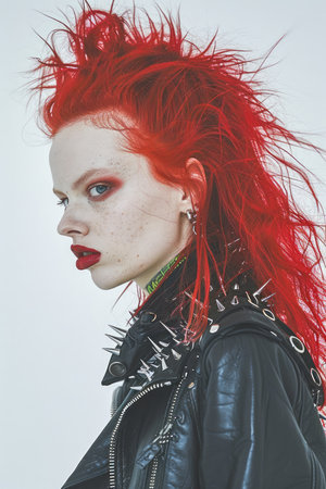 Edgy Model with Vibrant Red Hair and Punk Fashion Posing Against a Simple Background with Defiant Expression AI Generative