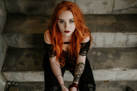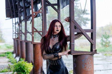 A gothic fashion model with long red hair, black leather clothing and dark makeup poses in an industrial setting. Alternative style portrait of a confident woman expressing edgy beauty and dark aesthetic.