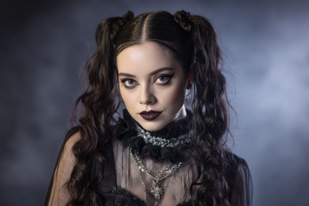 Young woman with dark eye makeup and lipstick, styled in gothic fashion. Her long wavy hair is in pigtails, and she wears ornate necklaces over a lace dress, exuding a mysterious vibe