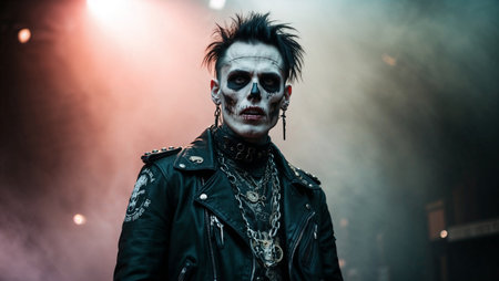 Close-up of man in skeleton makeup wearing punk-style leather jacket with chains. for Halloween themes, music events, or subculture concepts in various creative projects.