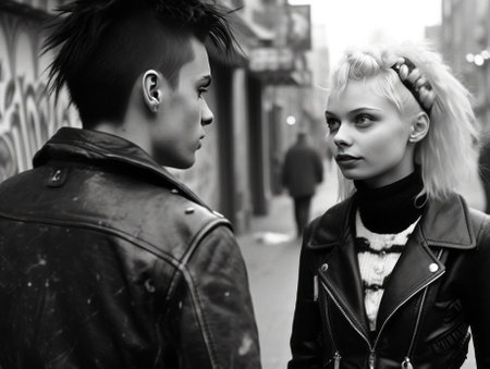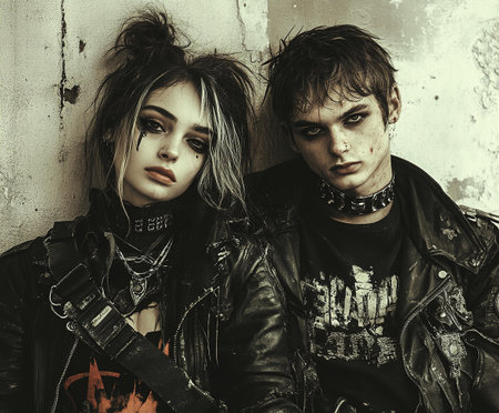 A man and a woman standing together, side by side, looking towards the camera, A punk rock concert with eccentric clothing styles, AI Generated