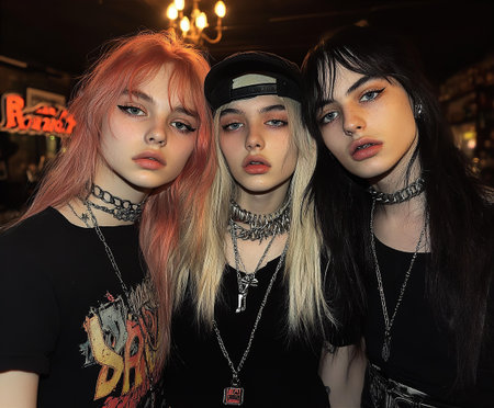 three young women in gothic outfits with pink hair
