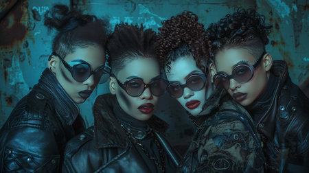Four Stylish Women in Dark Sunglasses and Leather Jackets Pose Against a Grunge Background.