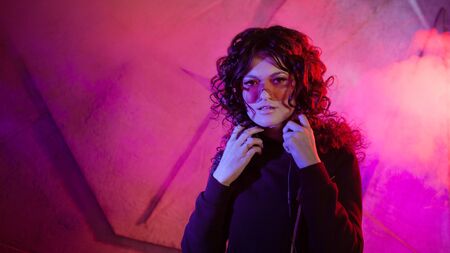 Young stylish curly woman in big sunglasses, moves to the music, taking off her headphones, dancing, closing her eyes, against the background of a wall, neon color, magenta, pink, purple.