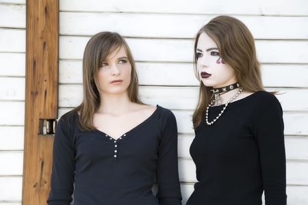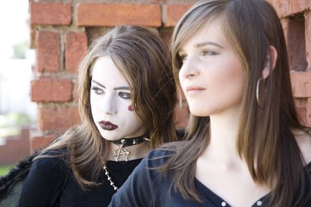 two young women dressed in gothic clothing posing for the camera