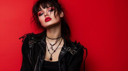 A woman with red lipstick and a black leather jacket poses for a photo. The image has a bold and edgy feel, with the woman's outfit and makeup adding to the overall vibe