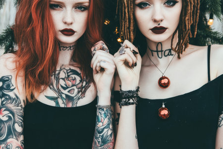 Edgy fashion portrait of tattooed models with bold makeup and unique hairstyles.