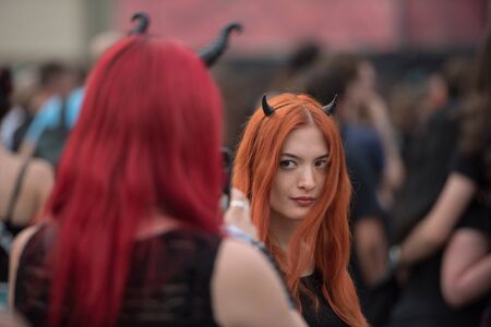 SIBIU, ROMANIA - JULY 27, 2019: Cheerful rocker girls enjoying the Artmania Metal Festival