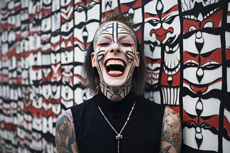 Portrait of a young punk girl with face painting on the wall.