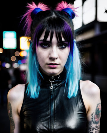An AI generated illustration of a young woman with blue hair and tattoos