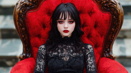 gothic woman in black lace dress sitting on red chair