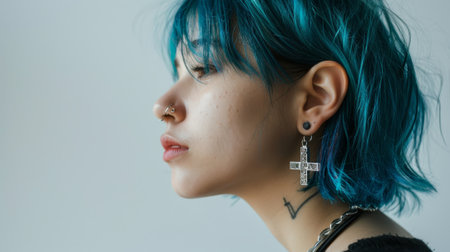 A side view portrait of a confident young female model with dyed blue hair and stylish cross earrings looking away against a white background.