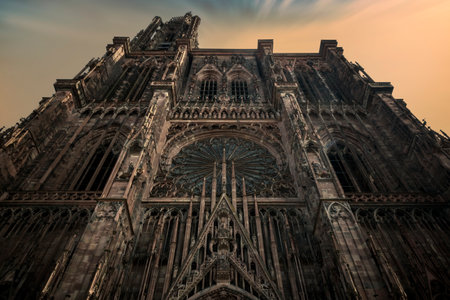 View of a Gothic Cathedral featuring an intricate architecture under a dramatic and cloudy sky