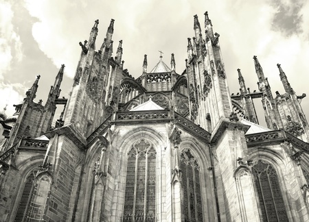 Exterior facade of St. Vitus cathedral in Prague Czech Republic. Architecture in gothic style, details of masterpiece religious building.