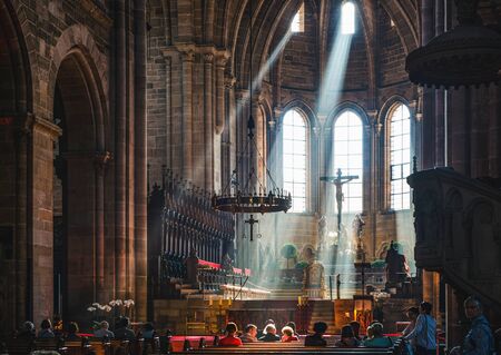 Light streaming through the windows of Bamberg Cathedral, Germany lighting up the altar in a spiritual scene