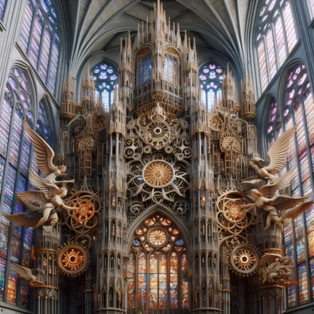 Stunning sci fi view of cathedral with tall spires and ancient stonework under blue skies