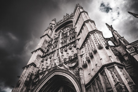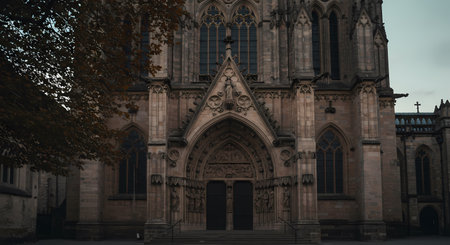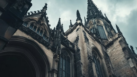 View of a Gothic Cathedral featuring an intricate architecture under a dramatic and cloudy sky