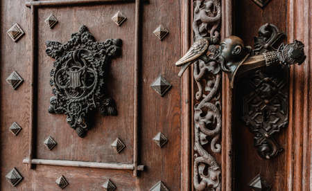 Rare beautiful wood door with handmade door handle. Bronze art and vintage keyholeof enter in castle. Woodwork craftsmanship.