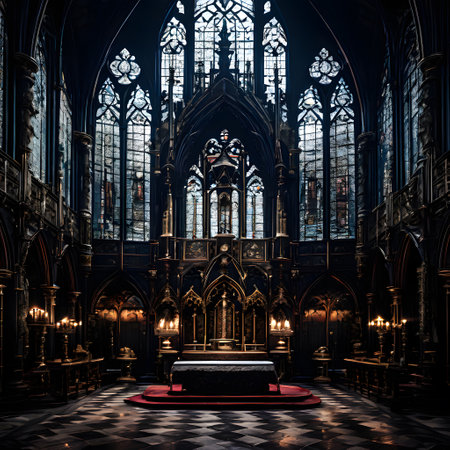 Majestic gothic basilica with stained glass windows and illuminated altar generated by artificial intelligence