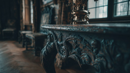 An antique table with detailed carvings is the focal point of the image. The setting appears to be indoors, possibly a historic building or a classically designed space. The composition emphasizes the textures and ornate details. Natural light filters through the window, illuminating the scene. Suitable for editorial and commercial use.