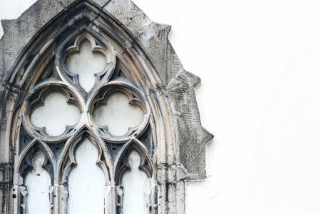 A close-up of an old Gothic window, its ornate design and pointed arches isolated against a stark white backdrop