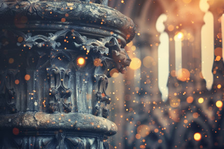 An elaborate stone pillar features intricate carvings and textures, softly illuminated by warm light, creating a tranquil and historic atmosphere.