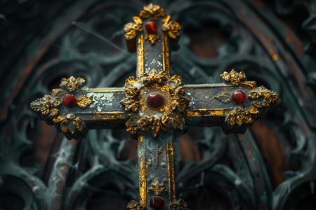 Ornate gold and turquoise cross with red jewels is showing the religious significance of the christian faith