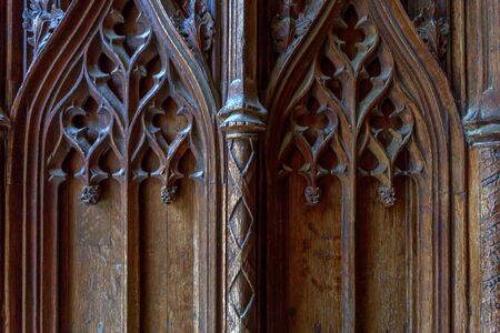 A detailed close-up shows a carved wooden panel featuring repeating Gothic arch designs and ornate embellishments. The warm brown tones of the wood contrast against a softly blurred background. The composition highlights the craftsmanship with a focus on texture and form, suitable for artistic or historical contexts.