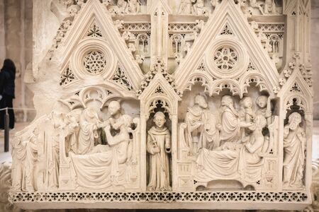 Alcobaca, Portugal - April 13, 2019: Tourists admiring the tomb of King Pedro I in the Monastery of Alcobaca, Portugal on a spring day