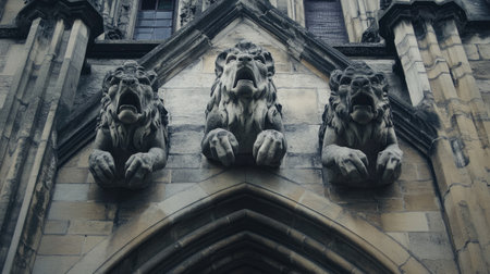 This captivating image features three stone lion sculptures adorning the facade of a historic building, showcasing intricate craftsmanship and architectural detail.