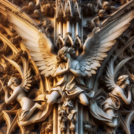 A cathedral spire transforming into ascending angels at sunset, Ai generated image