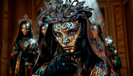 Elegant Venetian masks in golden hues with intricate details, creating a mysterious and opulent ambiance