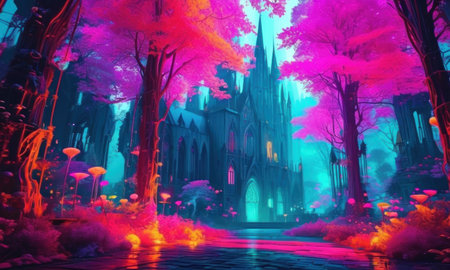 Fantasy landscape with gothic church and fantasy forest, 3d rendering