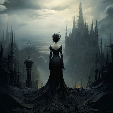 Gloomy Gothic illustration of a girl in a black dress on a castle background