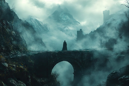 A fantasy landscape with misty mountains, an old bridge, and a mysterious figure standing on the far side of it. The scene is depicted in a dark, moody style using digital painting techniques. In the background, there's a castle visible through foggy clouds. This artwork has a concept art feel to it, with the overall mood being ethereal and dreamlike. --ar 3:2 --stylize 750 --v 6.1 Job ID: 545410dd-af2f-4d30-8141-0b9328d3999f