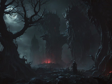 An eerie image of an ancient archway engulfed in mist within a dense, shadowy forest, evoking a sense of mystery and foreboding.