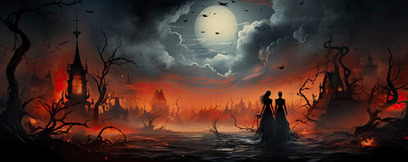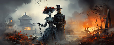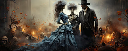 Happy Halloween banner post event party invitation background with dead skull couple skeleton