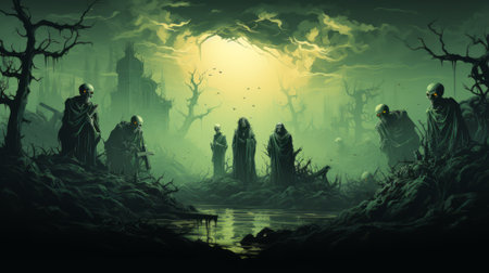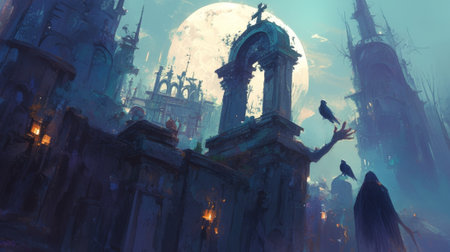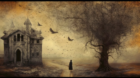 Evil nun's ascent from a crypt-like environment, her ominous presence gradually evolving into a spectral being against a backdrop of ethereal twilight. Generative Ai