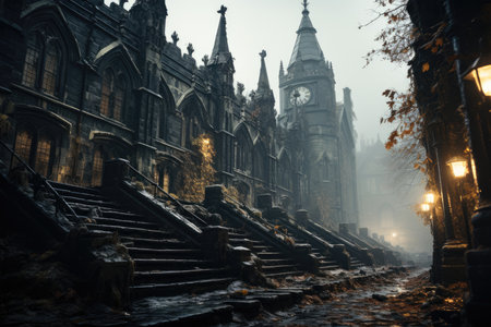 Low angle shot of towering old - world architecture, fresh snowfall, fog rolling in. Generative AI