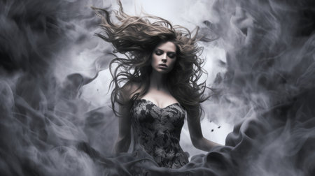 a photograph of a black woman with flowing black hair, dressed as a vampire angel. the wallpaper features a smokey background with a fluid formation style and solarization effect. captured by signe vilstrup, this photograph showcases photographically detailed portraitures and detailed costumes. the naturalistic ocean waves add to the overall aesthetic. perfect as a captivating wallpaper for those who love unique and artistic imagery. ai