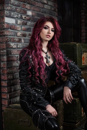 Attractive young woman with purple hair dressed in a black sweatshirt and leather pants. Beauty, youth fashion. Hair coloring. Cosmetics, make-up.