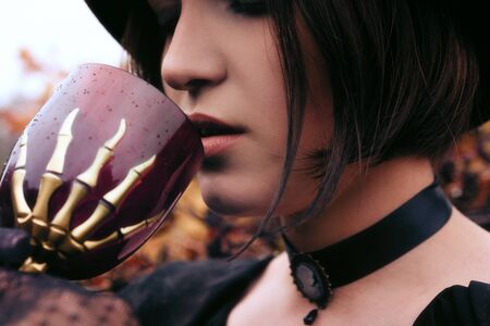 Closeup portrait of a woman in a black hat with a mystical cup in her hands sipping a drink from a beautiful burgundy goblet with raindrops or tears on it. Halloween holiday mood concept