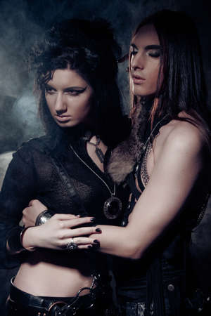 Romantic portrait of young gothic couple - man and woman over dark background.