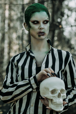 a witch holds in hands the skull of a demon. Halloween, a young woman at the carnival like a witch,
