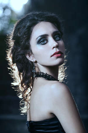 High fashion portrait of elegant woman in black dress. Bright makeup, studio shot.